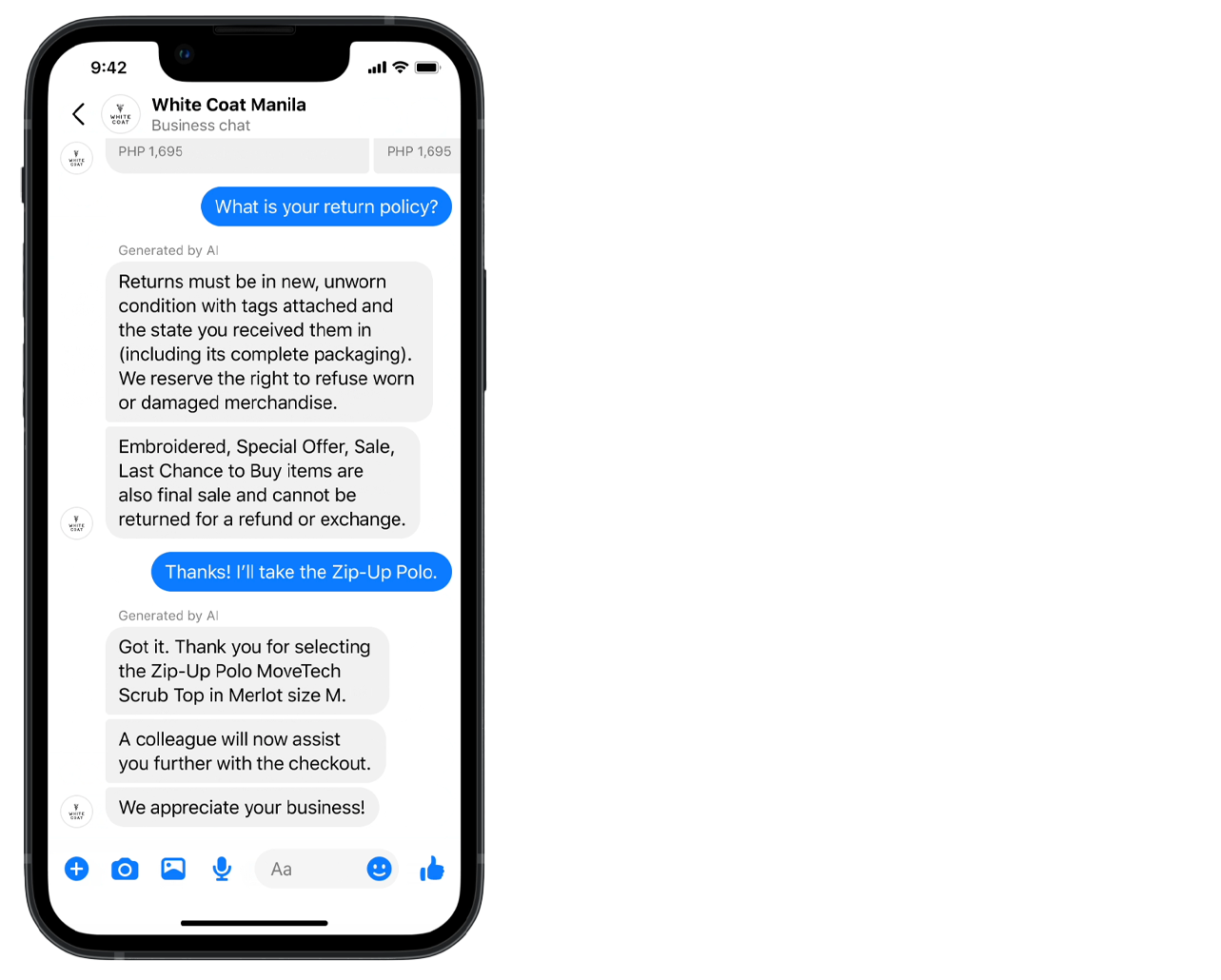 AI Chatbots on Messenger- Built with Meta’s latest large language model LLaMa 3, the chatbots can converse with customers about products and provide support — saving businesses like White Coat Manila 20% on service costs.