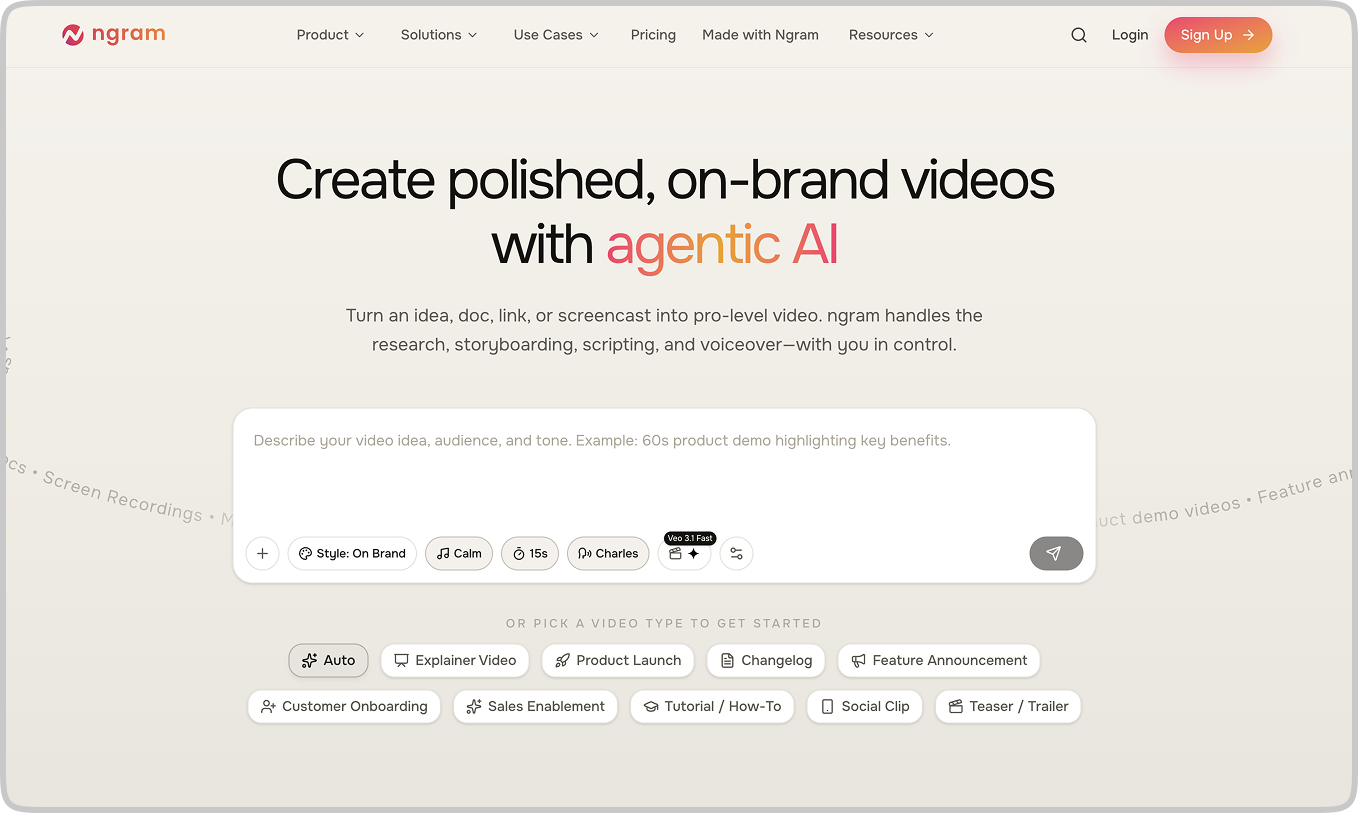 Ngram is an agentic AI video tool that turns any doc, URL, PDF, or screen recording into a polished, on-brand video — script, storyboard, voiceover, and motion graphics included. It's built for product and marketing teams who need professional video output without a production team or a three-day timeline.
