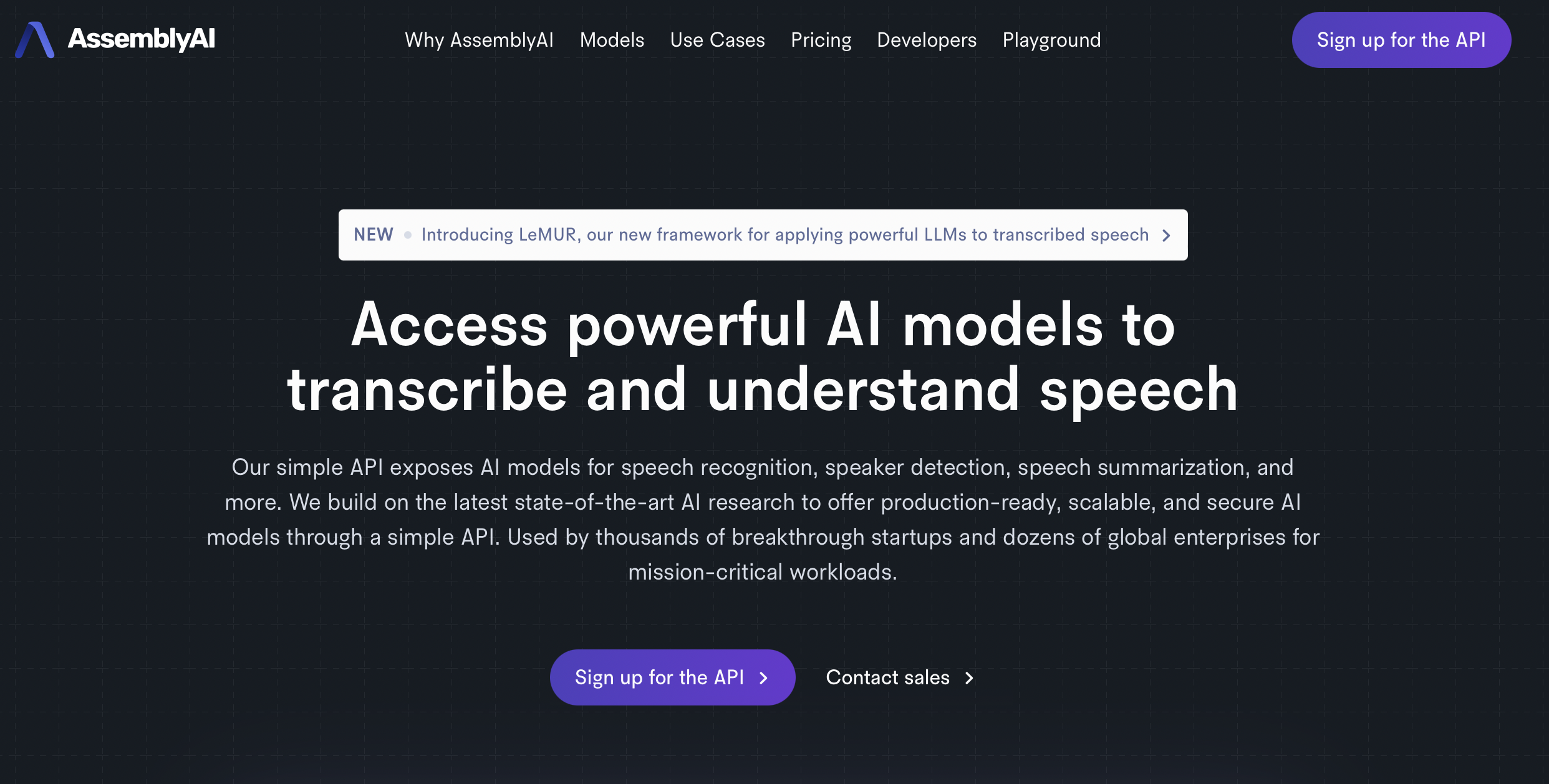 AssemblyAI - A cutting-edge technology platform that provides AI models to transcribe and understand speech. One use case of many is transcribing a YouTube video's audio into text. The platform is praised for its superior accuracy, even when compared to tech from some of the world's largest companies.