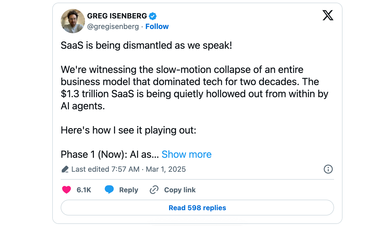 Tech entrepreneur Greg Isenberg argues we're witnessing the collapse of the SaaS business model as AI agents hollow it out from within.