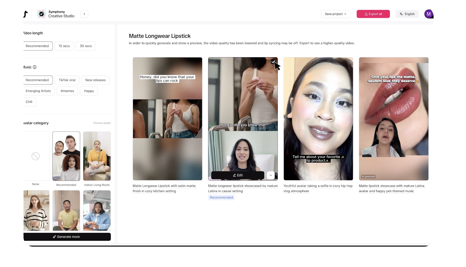 Here's how it works: Drop in a product link or info sheet, and the AI creates videos based on TikTok's top-performing content. It supports over 30 languages and offers pre-built avatars from licensed actors. You can also make custom avatars for their brand.
