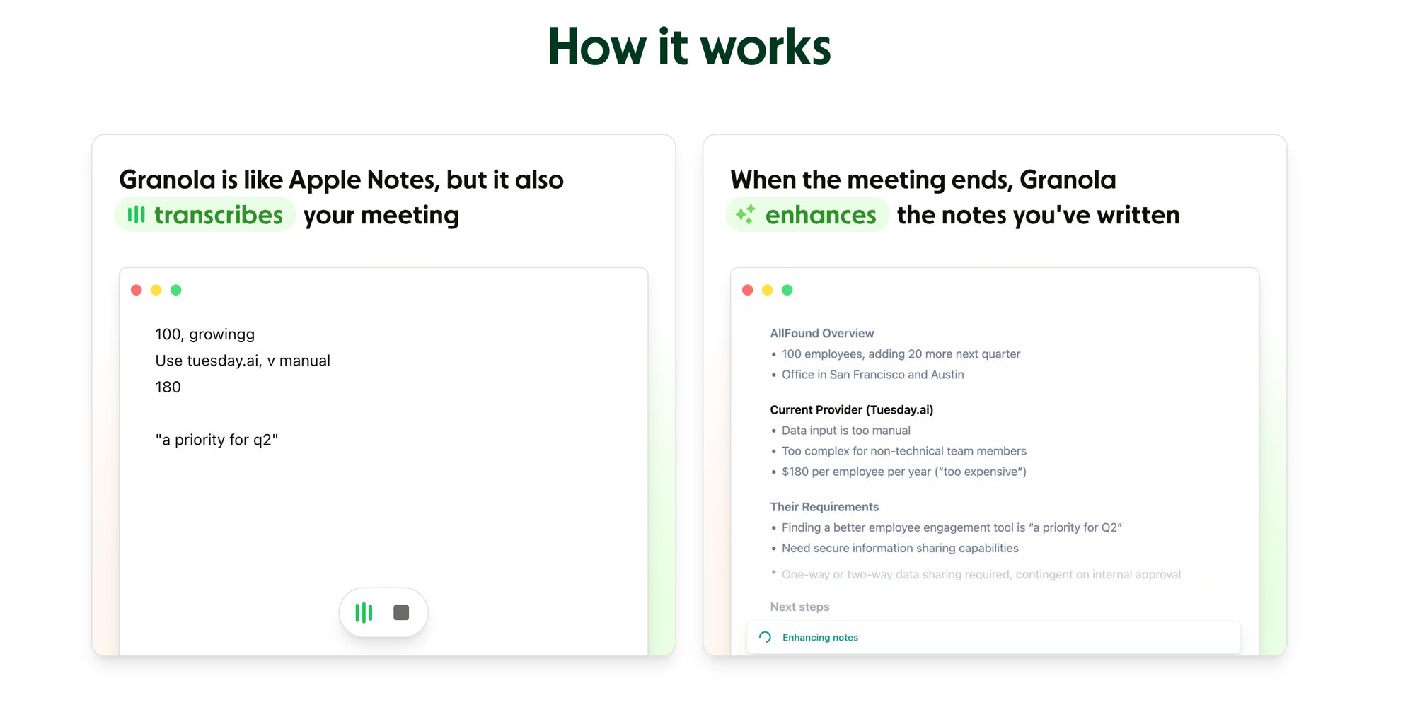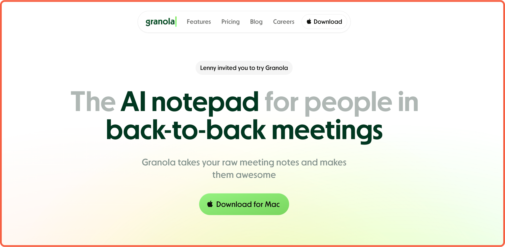 Granola is an AI notepad built for back-to-back meetings. You take quick notes. It listens on your device and builds a clean transcript in real time. No meeting bots join your calls. After the meeting, the AI turns your notes and transcript into clear summaries with decisions and action items.