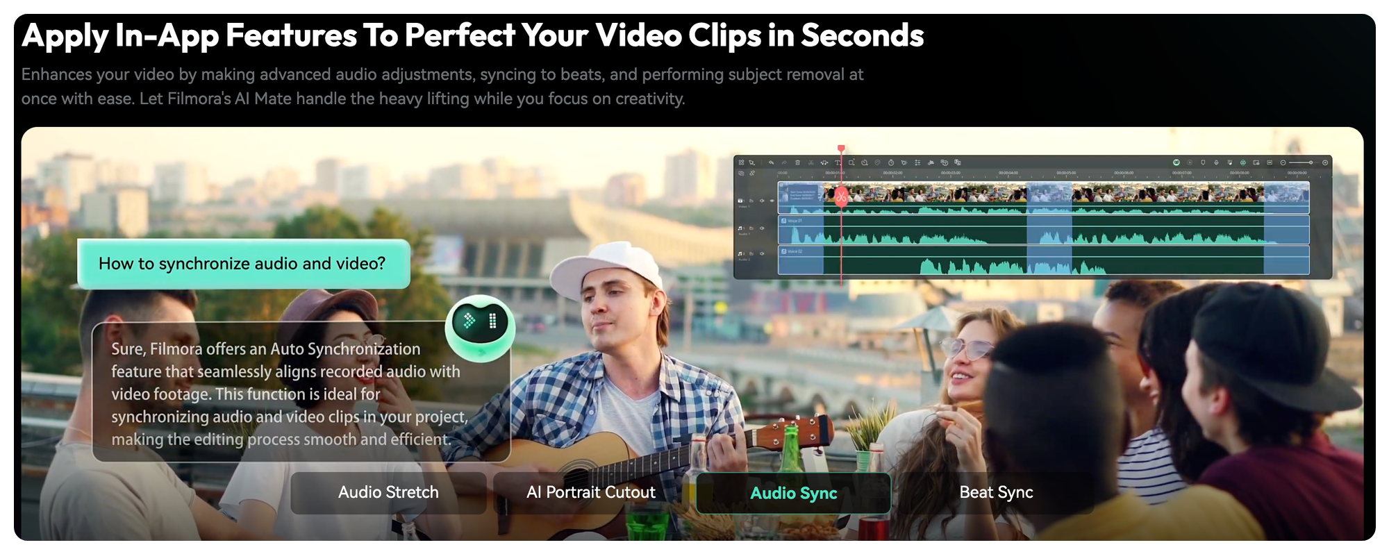 Filmora’s AI Mate is an in-editor AI copilot that lets you “talk to your timeline” so you can execute edits, learn where features live, and even generate new video materials from a prompt, without digging through menus.