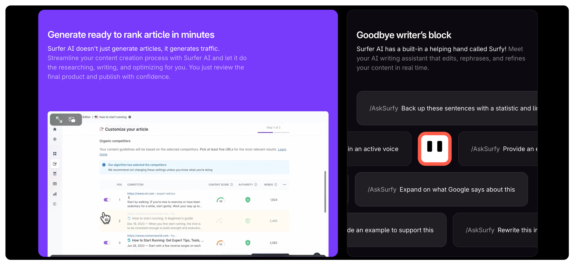🤖 Surfer AI: Generate optimized articles that rank with just a click, letting the AI do the heavy lifting of researching, writing, and optimizing your content.