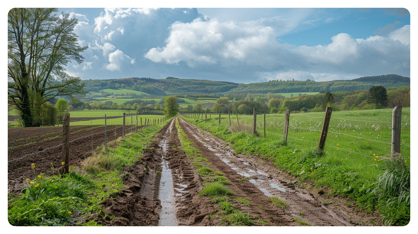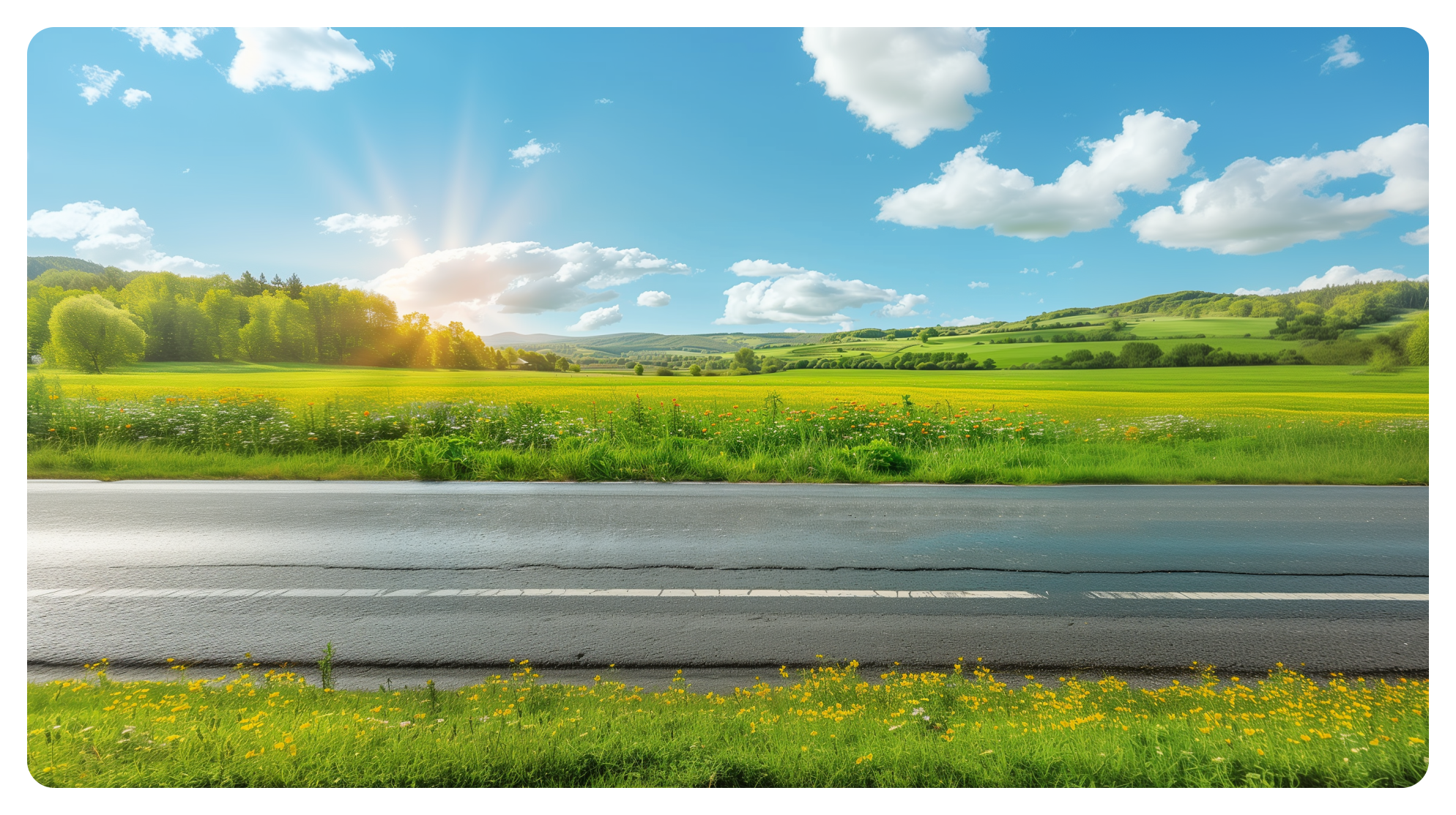 An image of the countryside, lateral perspective from across the opposite side of the road, Canon EOS RP, f/4 lens, --sref https://s.mj.run/SXQUO_EnR4o --style raw --ar 169️⃣