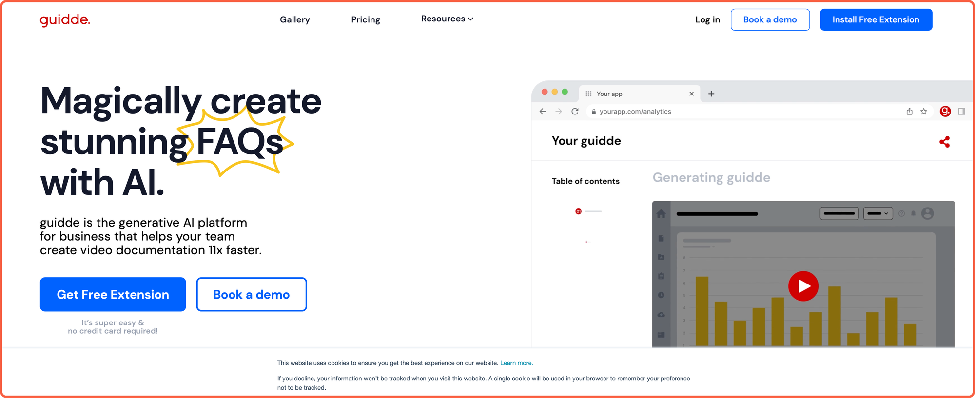 Guidde is an AI-powered platform that transforms the way businesses create and share video documentation. It's a game changer for how you create guides and tutorials. By leveraging advanced AI technology, Guidde enables teams to capture knowledge and explain complex workflows 10 times faster. The result is stunning, personalized video content. Perfect for customer support, onboarding, and training.