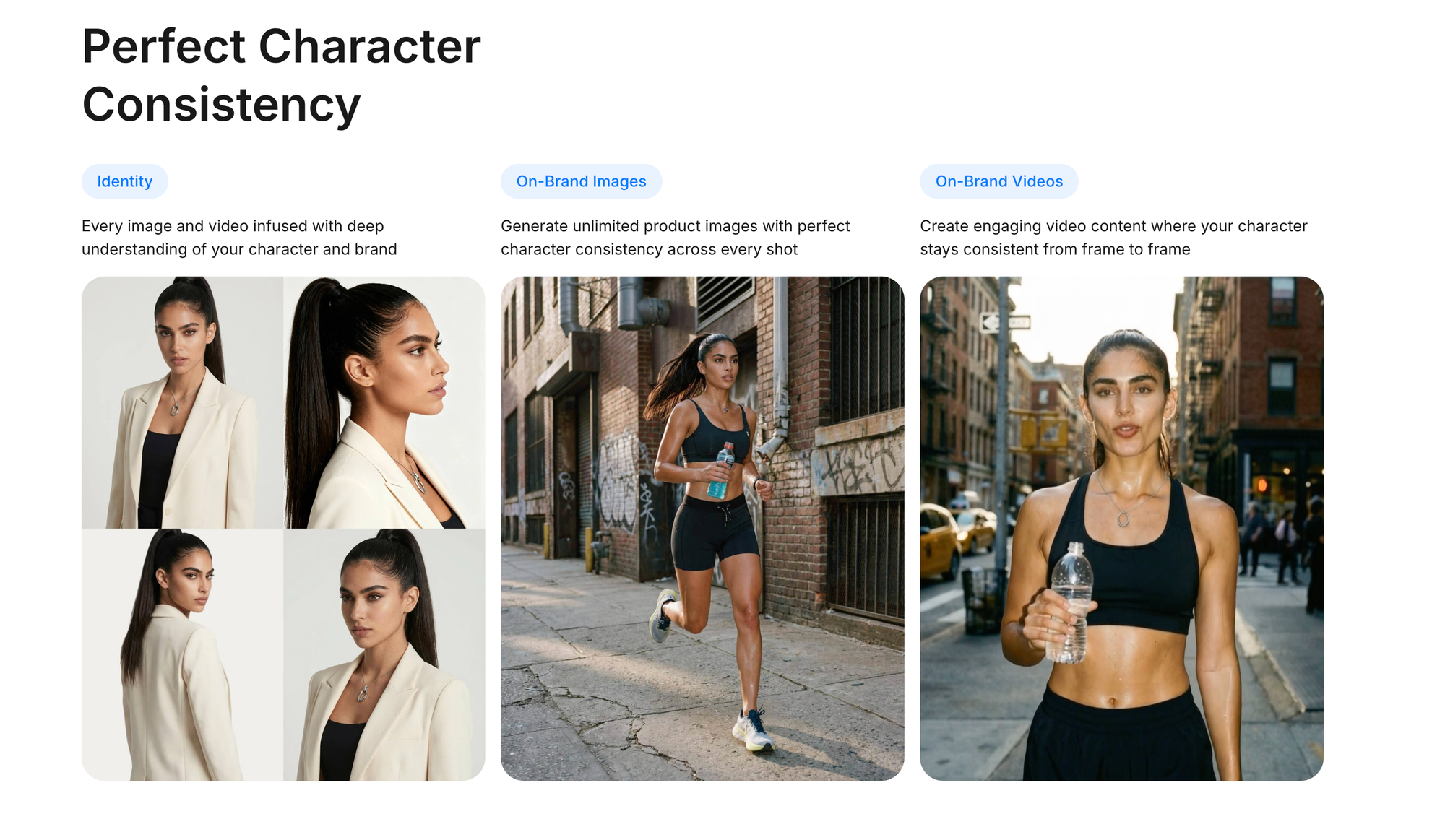 👤 Lock In Character & Brand Consistency: Build custom personas that stay visually consistent across every image and video you create, so your hero character, model, or mascot never drifts between shots or scenes.
