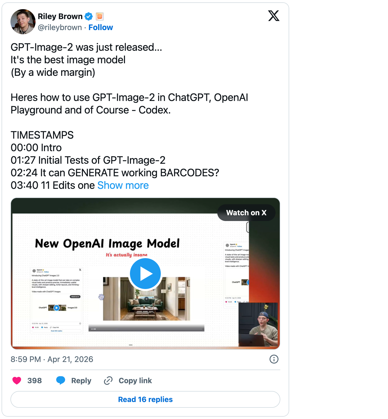 - The human is out of the prompting loop. Brown told a Codex agent to pull his Readwise saves and build a slideshow of GPT-Image-2 renders annotated over each tweet. He wrote zero image prompts...the agent wrote them all.