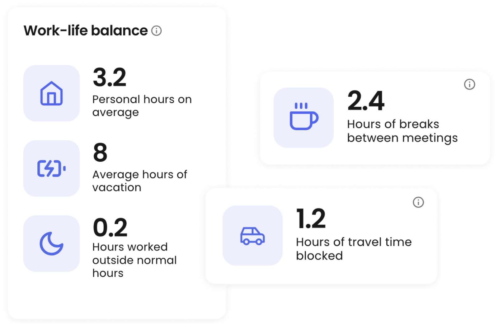 Track work-life balance trends: Keep yourself from burning out with key work-life balance metrics that track how many hours you’re working overtime, how much time you’re spending on personal activities, and whether you’re taking enough time off for vacation.
