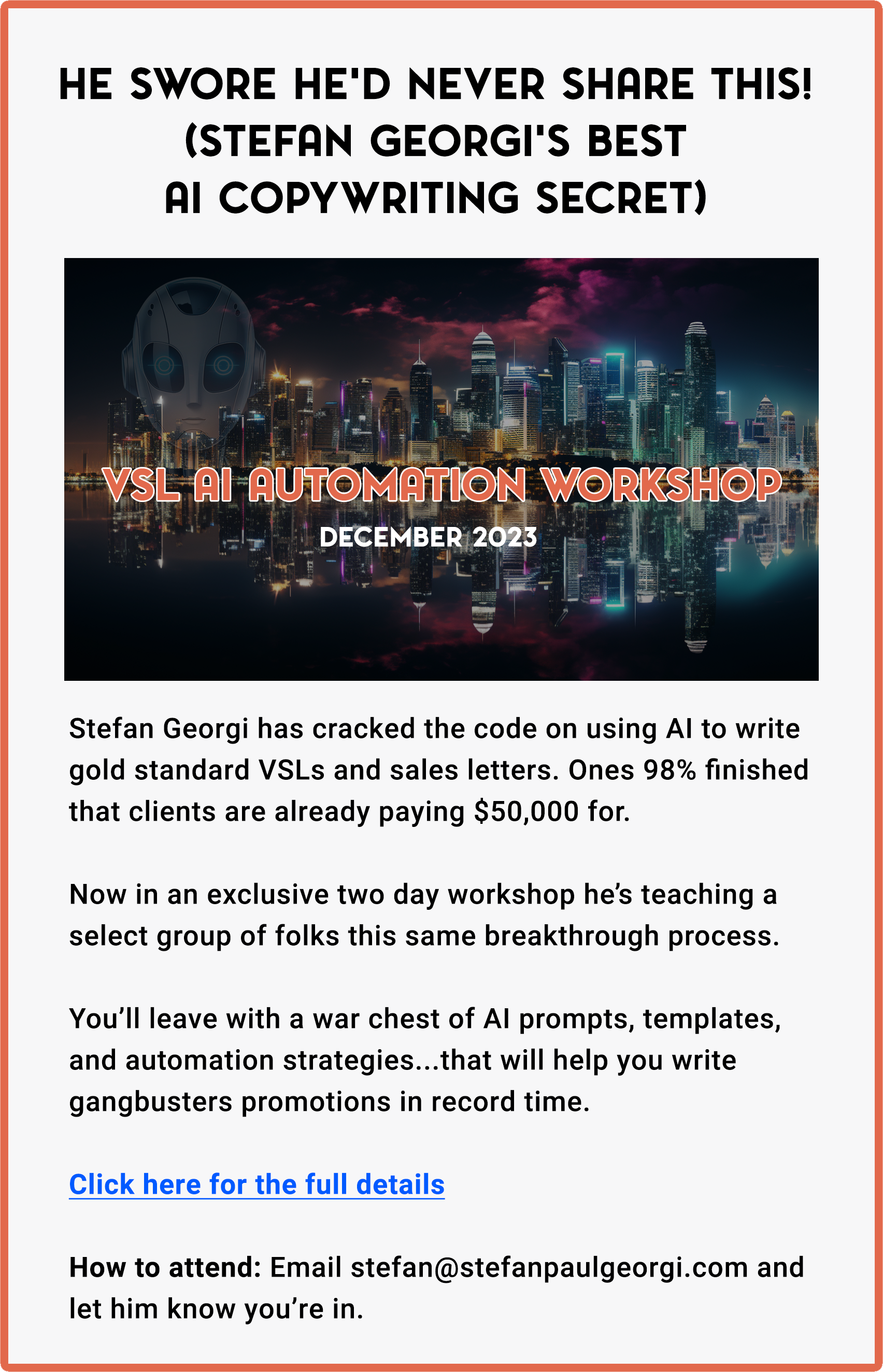 p.s. Need A-List copy delivered at unprecedented speed? Three of the world's top copywriters have joined forces and are using the power of GPT-4 to write high-converting ads, emails, and VSL's.
