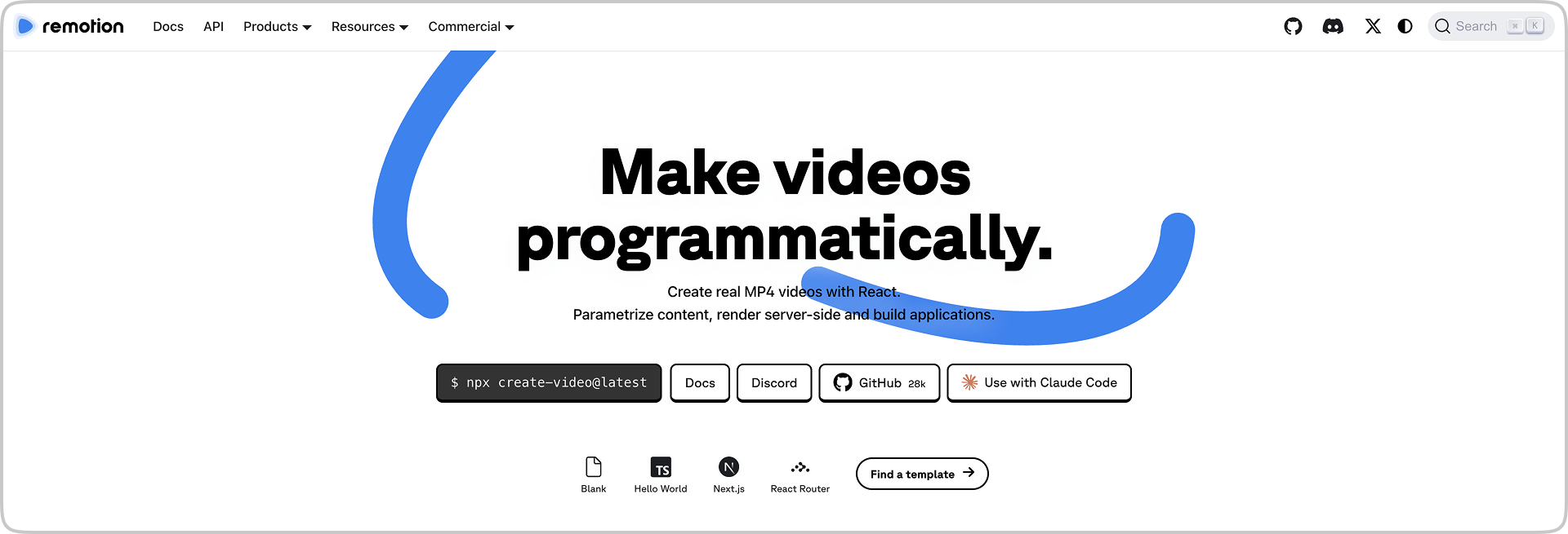 Remotion lets you create videos programmatically using React - turning code (written by you or any chatbot) into motion graphics, animated explainers, data visualizations, and dynamic video content at scale.