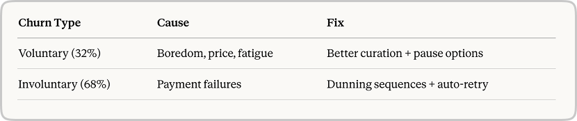 But here's the twist... 68% of subscription box churn is involuntary. Not angry customers. Not boredom. Failed credit cards. Expired payment methods. People who wanted to stay but got silently dropped.