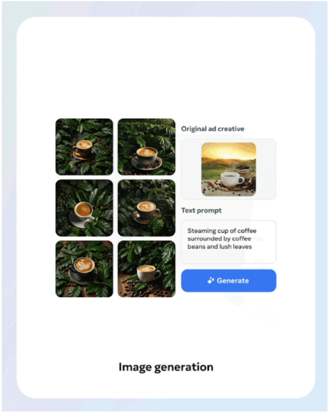 In one example, Meta shows how an existing ad creative showing a cup of coffee sitting outdoors next to coffee beans could be modified to present the cup, from a different angle, in front of lush greenery and coffee beans, evoking imagery reminiscent of a coffee farm.