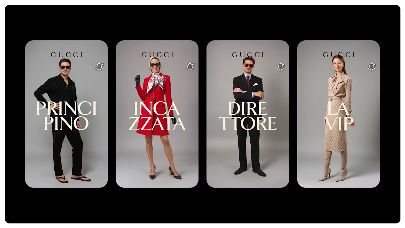 Snapchat users can now become a Gucci character with a single tap. The Italian house is the first luxury brand to launch a Sponsored AI Lens on the platform, built around its La Famiglia collection. Generative AI transforms your selfie into one of six styled personas, from a '60s red coat rebel to a tailored suit boss.