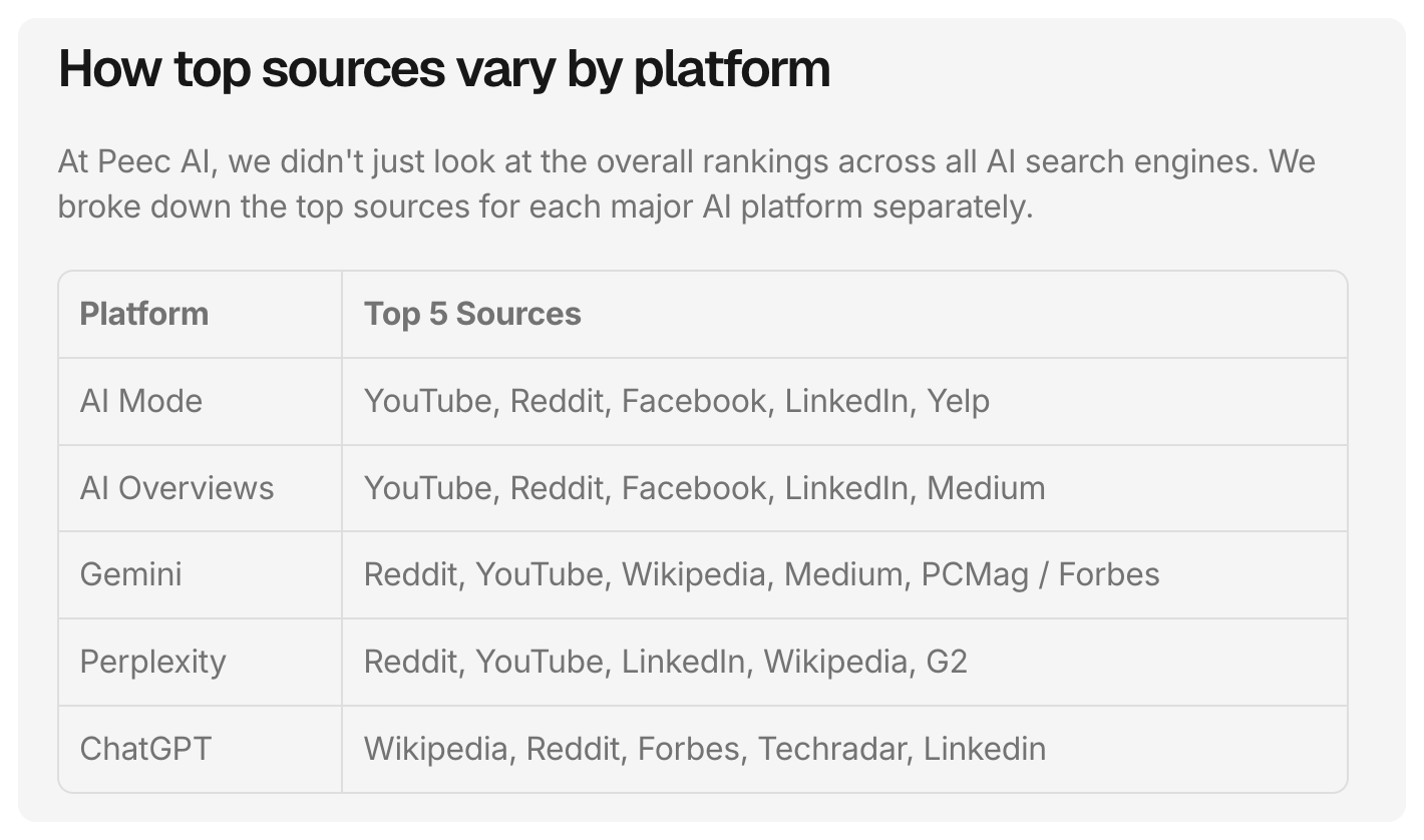 The platforms diverge after that: Google's tools lean toward social content and Yelp, while ChatGPT pulls more from editorial sites like Forbes and TechRadar.