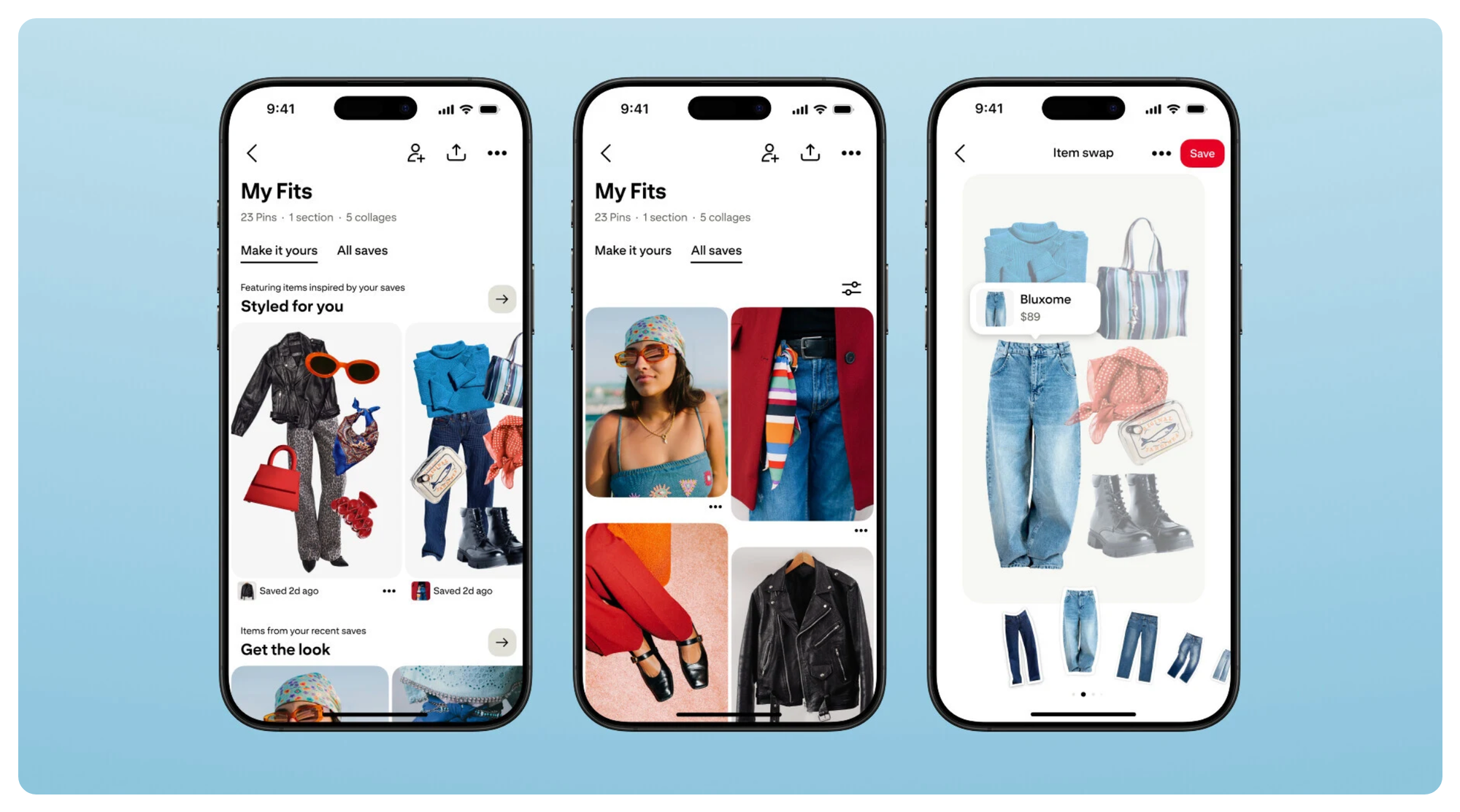 They're also adding tabs to organize pins: "Make It Yours" recommends fashion and home decor products based on saved pins, "More Ideas" suggests related content across beauty, recipes, and art, and "All Saves" shows everything you've saved. The overall vision here is to turn boards from organizational tools into personalized shopping and inspiration engines.