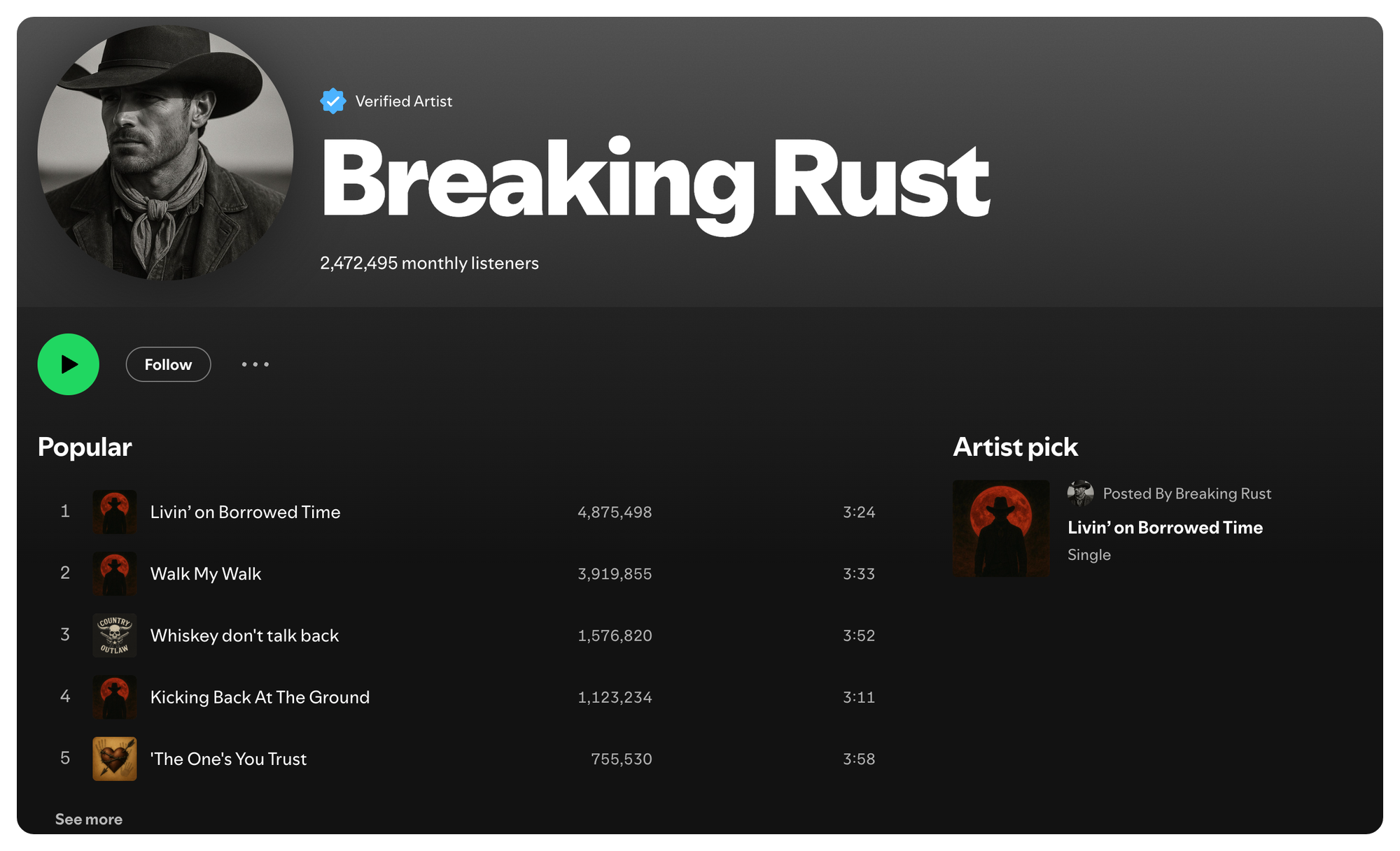 Breaking Rust... yeah, that's a computer... has the #1 song on Billboard's Country Digital Song Sales chart right now. "Walk My Walk" beat every human artist in paid downloads. Another AI called Cain Walker sits at #3. Breaking Rust pulls 2.4 million monthly Spotify listeners, which is genuinely insane for something that doesn't exist.