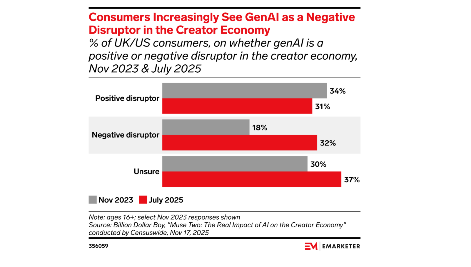 People are growing more suspicious of AI in the creator economy. The share of consumers viewing generative AI as a negative disruptor nearly doubled, jumping from 18% to 32% since November 2023, according to Billion Dollar Boy and Censuswide.
