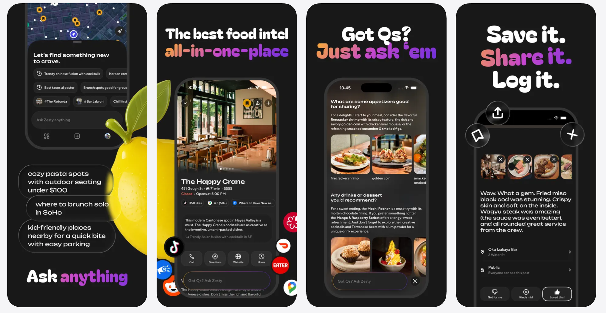 Zesty pulls data from DoorDash, Google Maps, TikTok, and Reddit to generate suggestions. It also adds social features like photo sharing and following other diners. The goal is owning more of the local commerce experience, from discovery all the way through delivery.