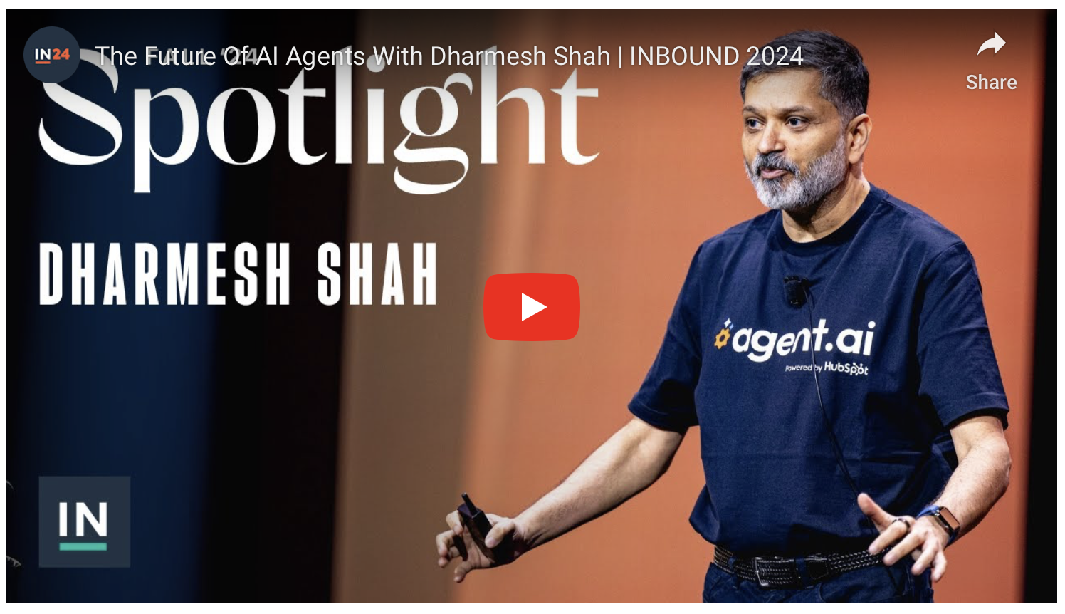 In a fantastic keynote at INBOUND 2024, HubSpot co-founder Dharmesh Shah unveiled Agent.ai. It's the world's first professional network for AI agents. Shah predicts that in the near future, workplace teams will be hybrid, consisting of both humans and AI agents collaborating together.