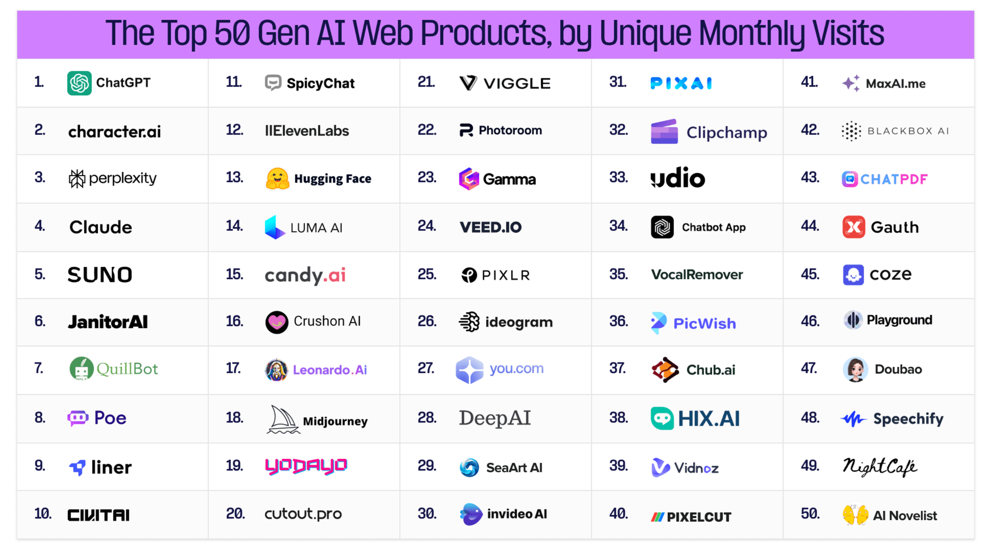 Every six months, the venture capital firm takes a deeper dive into the data to rank the top 50 AI-first web products (by unique monthly visits) and top 50 AI-first mobile apps (by monthly active users).