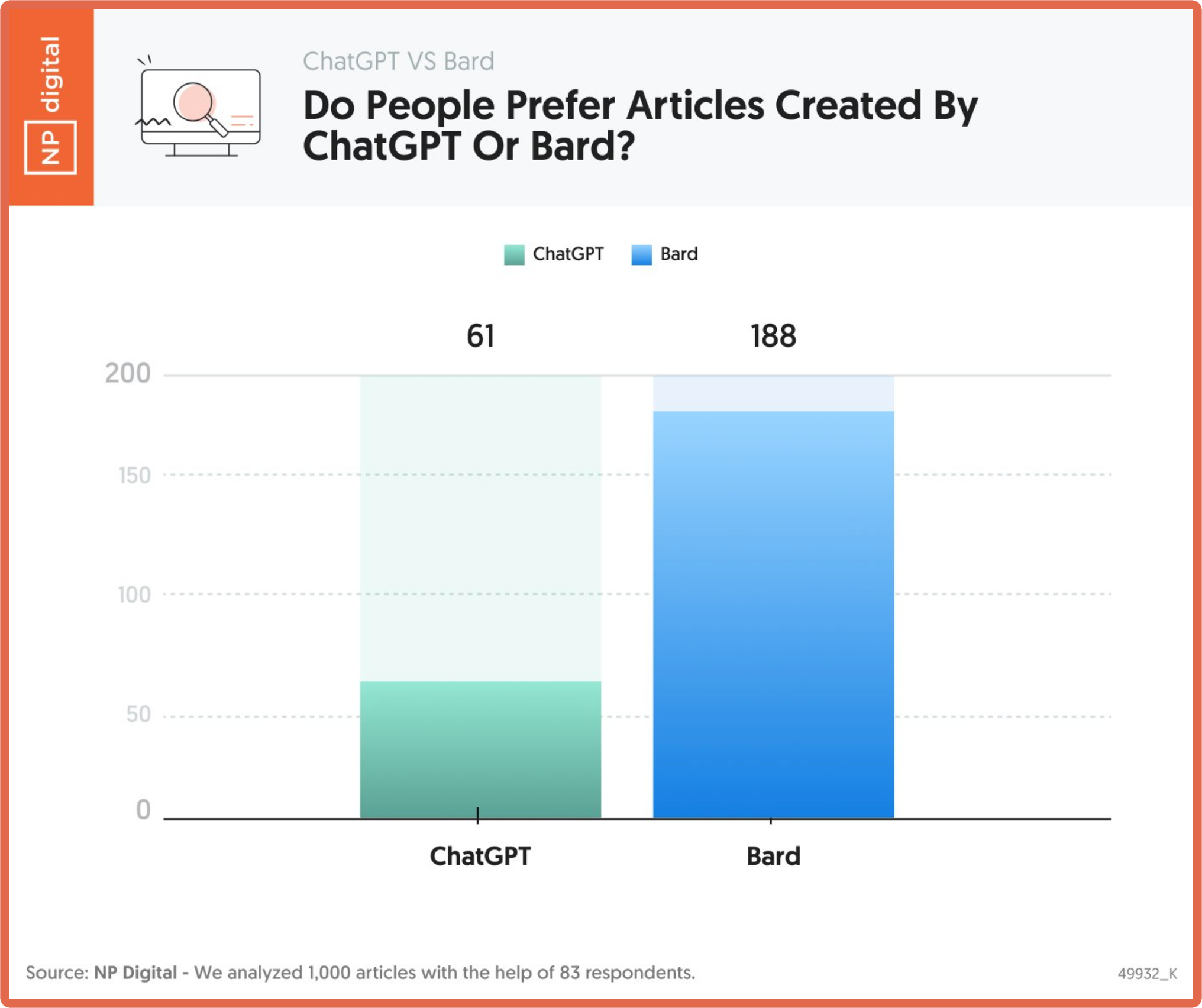 Do people prefer content written by ChatGPT or Bard?: Marketing expert Neil Patel had ChatGPT create 1000 articles on various topics. He then gave Bard the same instructions on the same topics. In total, his team created 2000 pieces of content with AI.