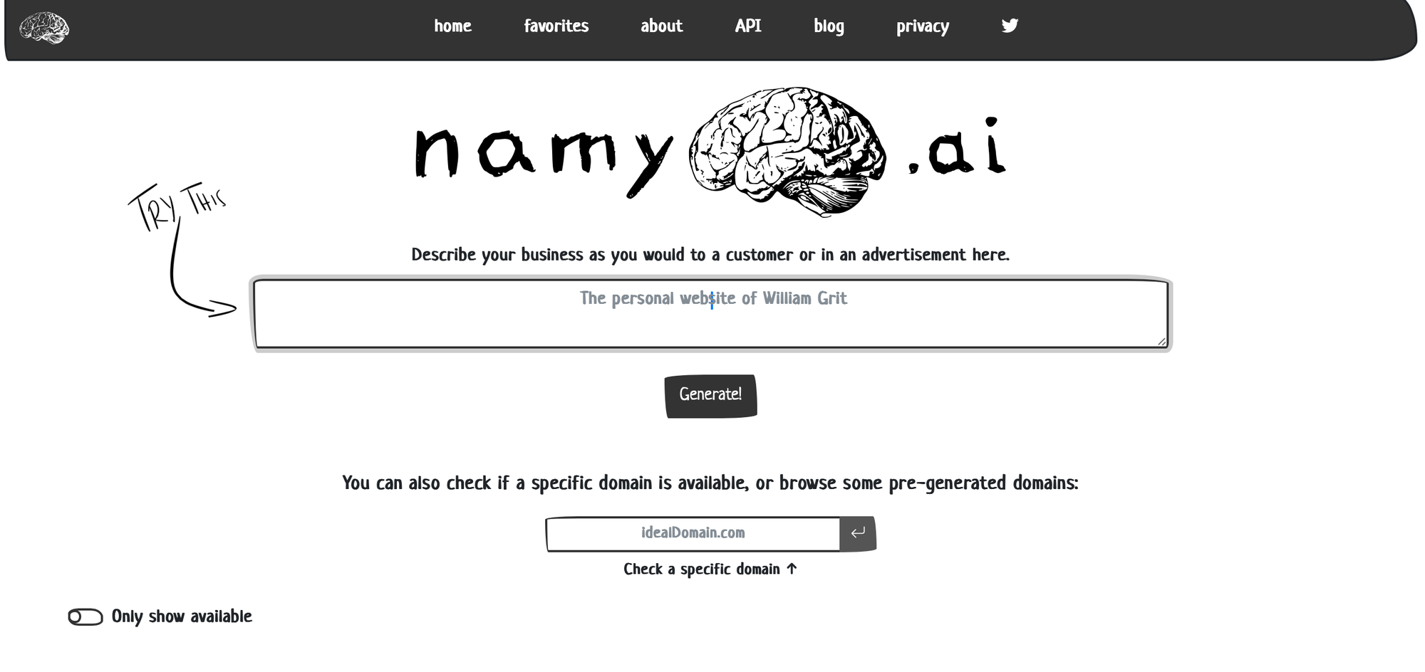 Namy.ai is an AI-powered tool designed to help you come up with unforgettable names for your business. More importantly, a business with a domain that's available. Because we've all come up with the next Google in our heads only to find out the domains already taken.