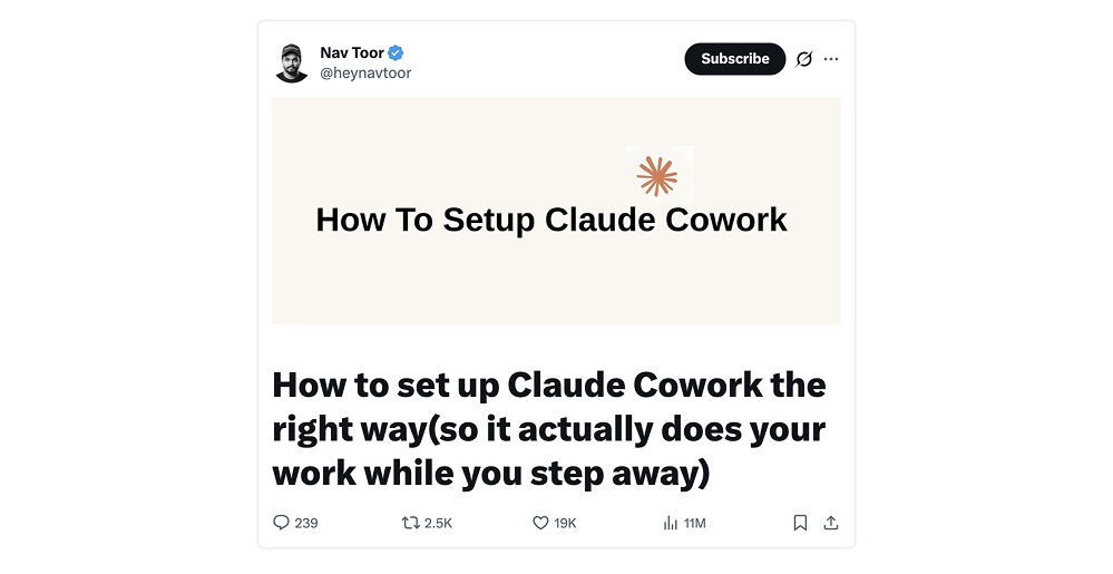 AI Enthusiast Nav Toor spent three years testing AI workflows before Cowork became the first thing he opens every morning. His setup guide is the one he wishes someone handed him on day one, and it lands on one conviction: stop writing better prompts and start building better context.